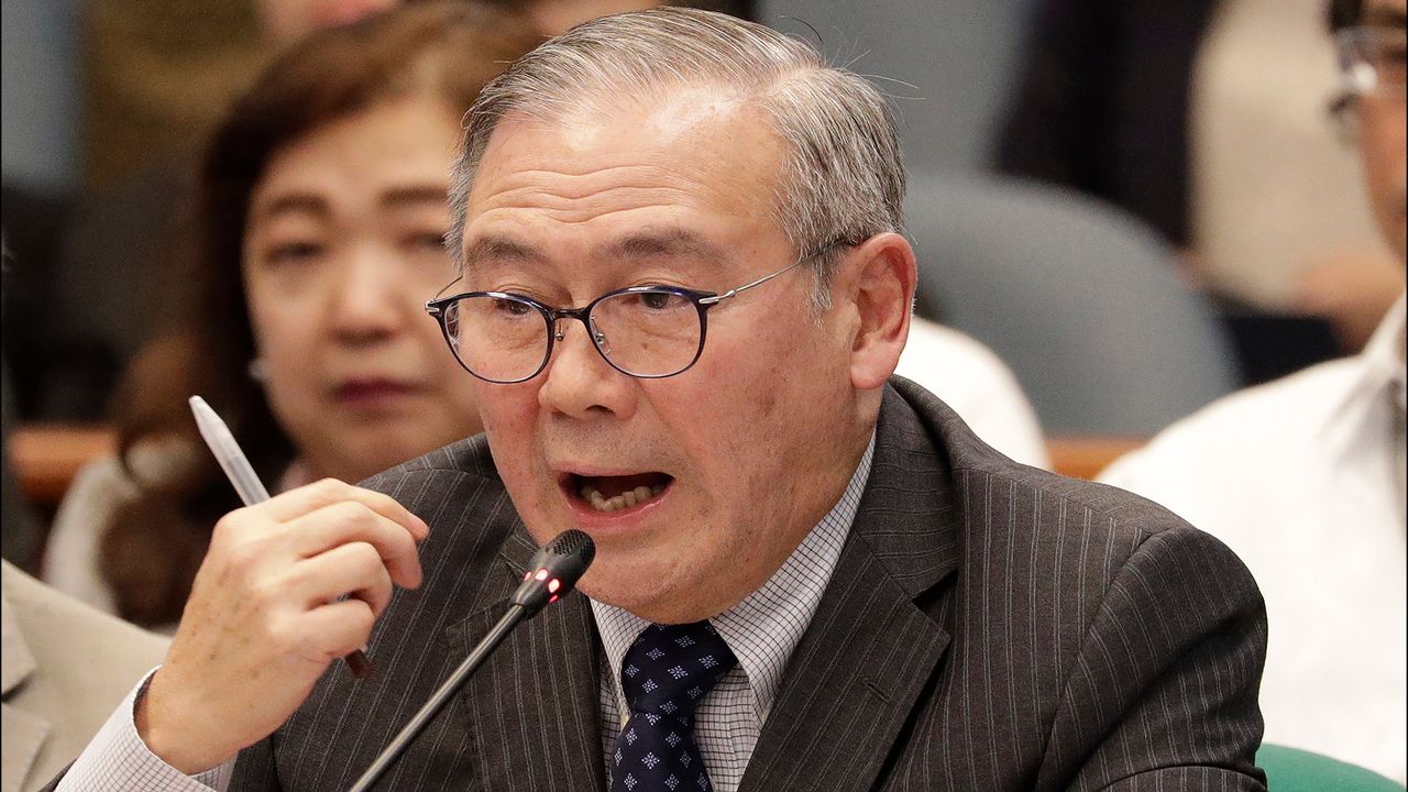 In this Feb. 6, 2020, file photo, Philippine Secretary of Foreign Affairs Teodoro Locsin Jr. gestures during a senate hearing in Manila, Philippines. (AP Photo/Aaron Favila, File)